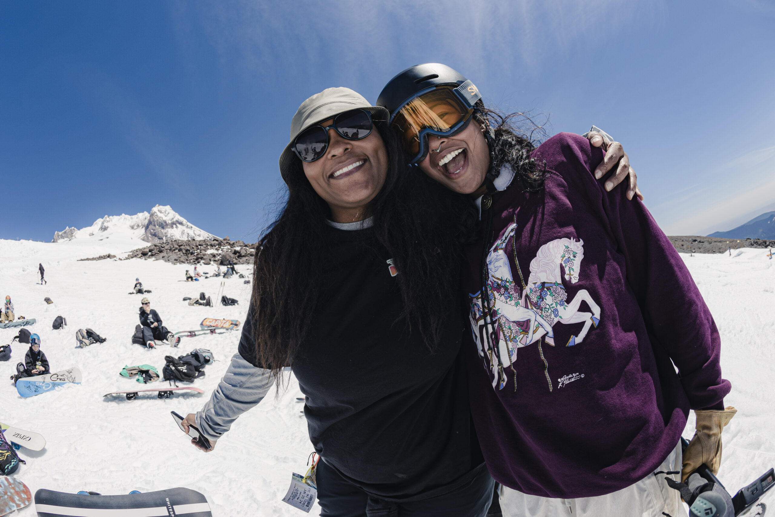 Annette Diggs has been another familiar face on the glacier these past few summers. As the creator of Edge Outdoors, you can find her ripping a jump on skis or board year round. Here, she and Jen Picarazzi live it up on a picture-perfect day on Mount Hood.
