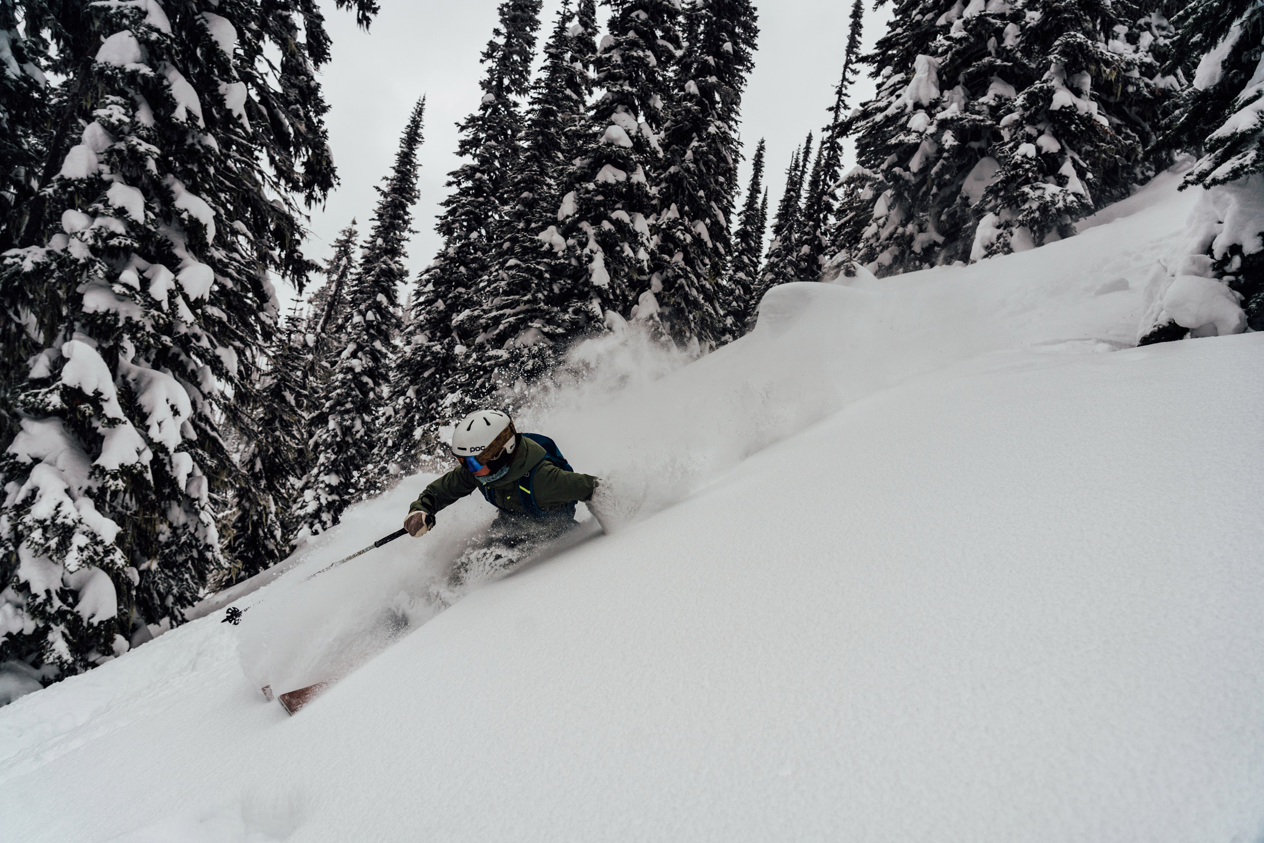 We began the first day chasing each other through a burn zone above the lodge, a massive swath of terrain that a forest fire raged through back in 2003. Its aftermath left trees spaced perfectly for skiing—rolling forests ideal for party laps. There’s always a buzz of excitement on day one, and we leapfrogged through boottop powder, giddy with good fortune at the plethora of dry, silky smooth powder spilling out around us.
