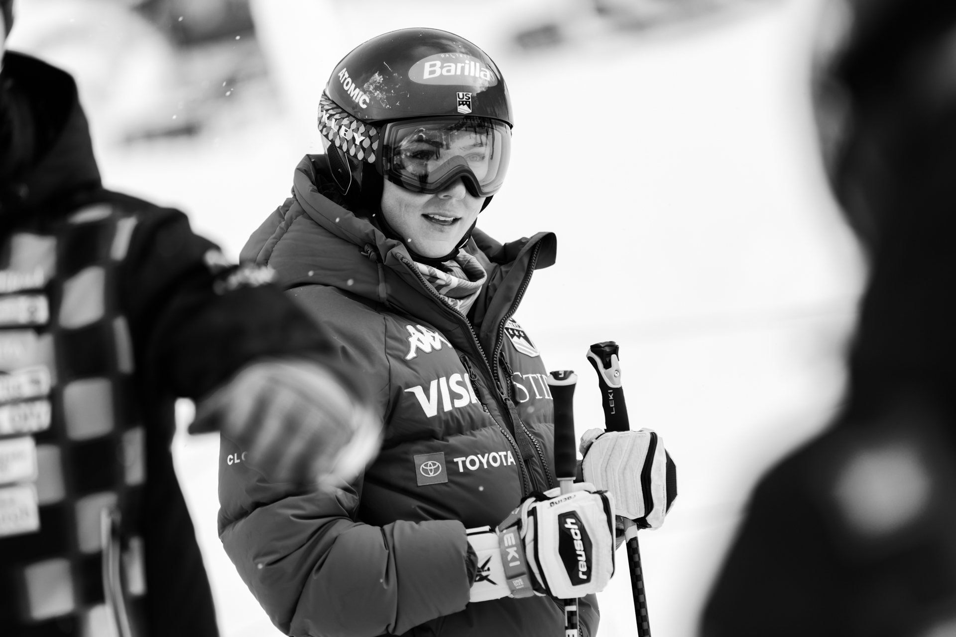 Mikaela Shiffrin before heading up to the start of the GS race. All eyes were on the skiing superstar as the skier vied for her 100th win at the home race.