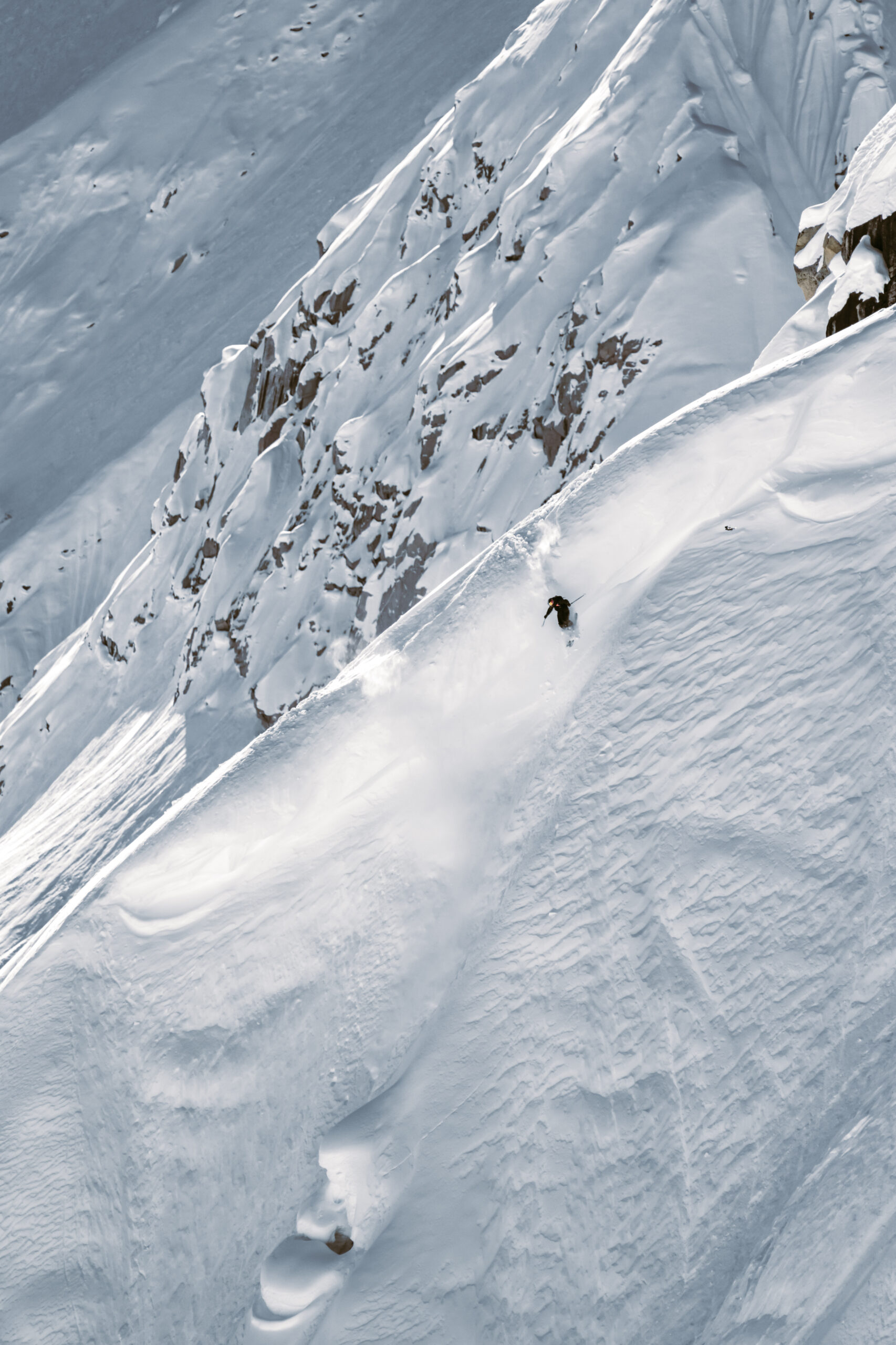 Competition day was filled with variable snow, a sun crust baking solar aspects with soft, cold smoke lingering on shaded slopes. Line choice was crucial, and all 12 athletes battled it out in the tournament-style competition. They utilized two different sides of the Priority 1 face, so athletes who made it into the second and third rounds got to start with a blank slate on the towering face above camp.