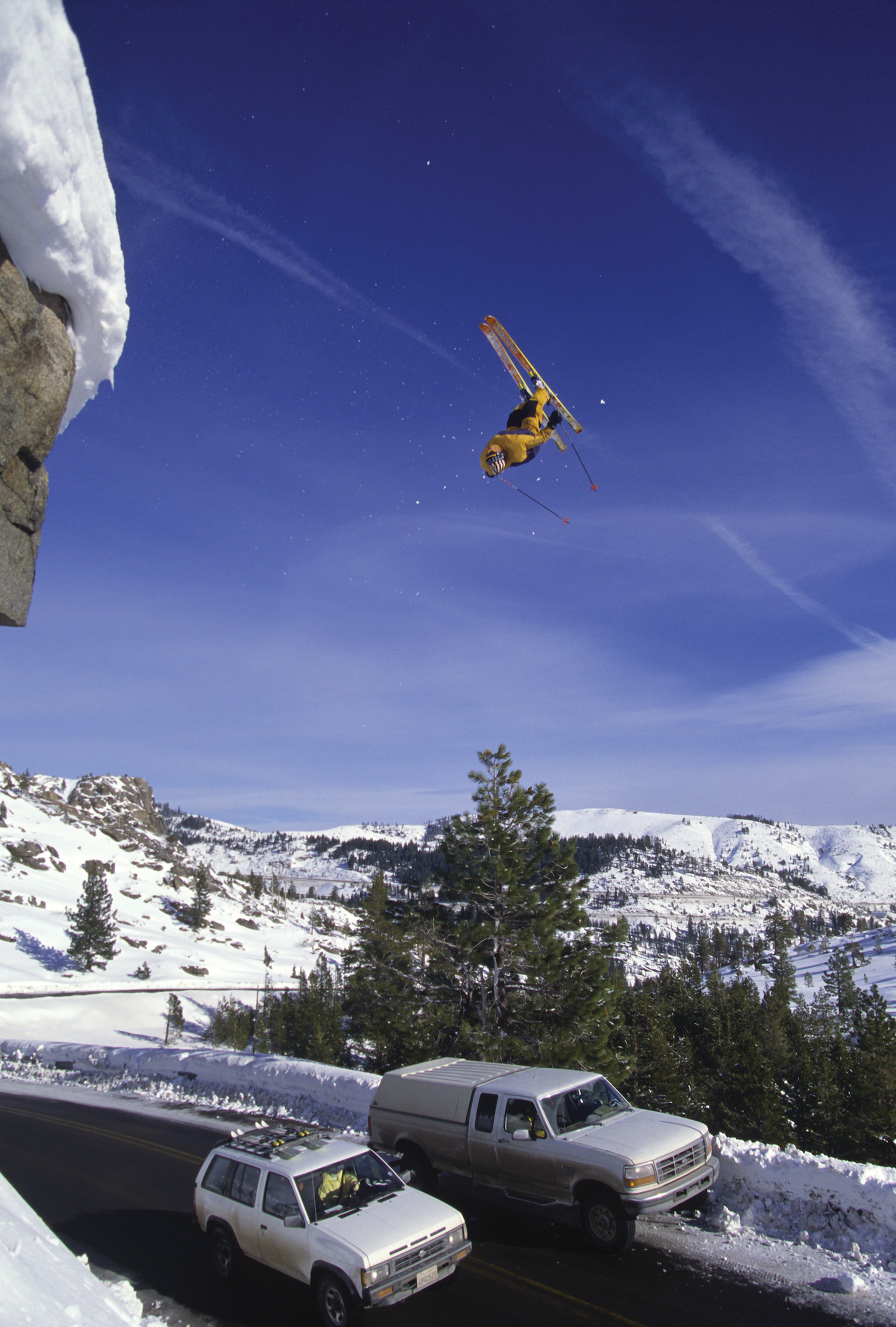 “Aaron McGovern, Tahoe local, big mountain extreme skier and coach at Palisades Tahoe jumps over Highway 40 on Donner Pass, CA, circa January 1998. The Highway 40 road gap has been a zone for extreme skiers and snowboarders for years, and we were here shooting alongside the Jones brothers. The exact spot varies according to snow level, and it needs to have a perfect takeoff and landing. This was a high snow year in Tahoe, and we hit it just right. As you can see, this was before the use of helmets.” Photo: Hank de Vré
