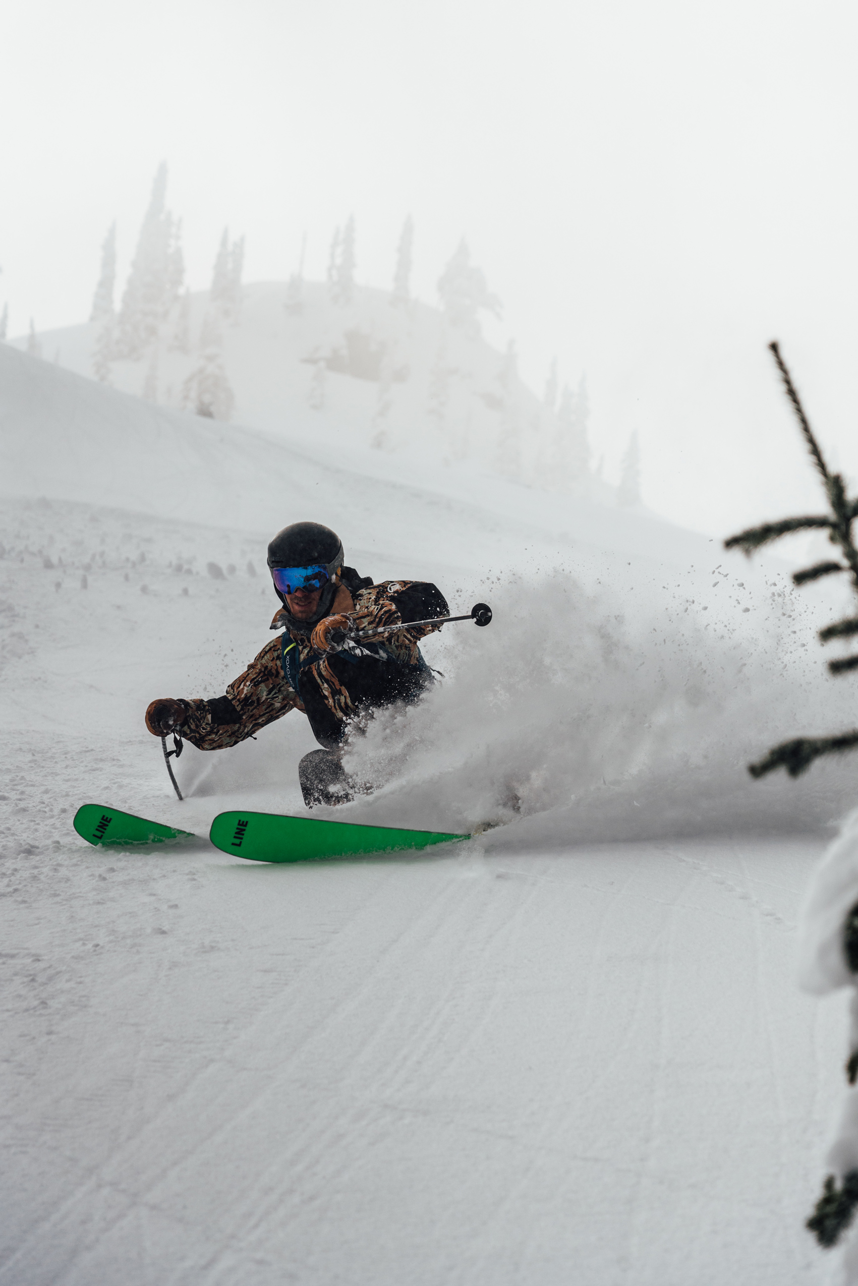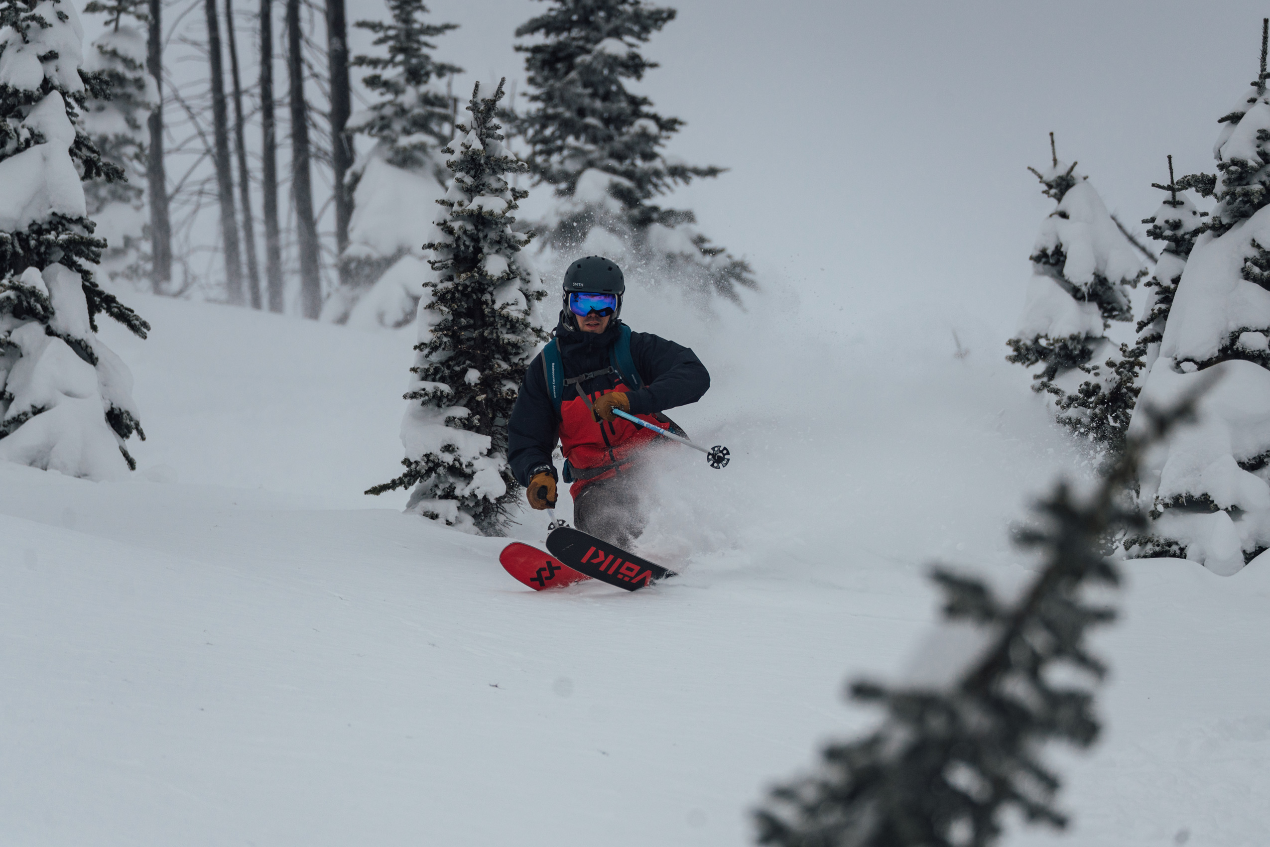 We began the first day chasing each other through a burn zone above the lodge, a massive swath of terrain that a forest fire raged through back in 2003. Its aftermath left trees spaced perfectly for skiing—rolling forests ideal for party laps. There’s always a buzz of excitement on day one, and we leapfrogged through boottop powder, giddy with good fortune at the plethora of dry, silky smooth powder spilling out around us.