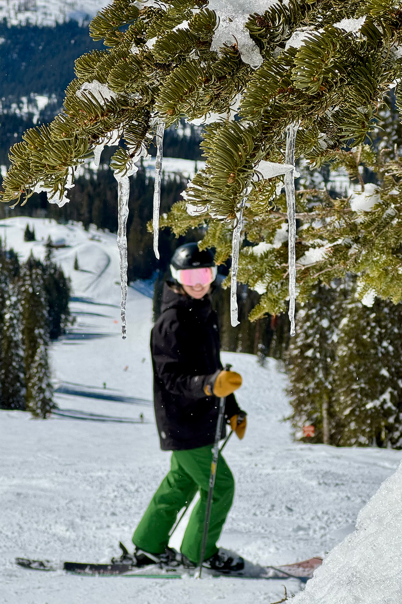 The combination of a cloudless sky and warm air lends way for our hardpacked, icy morning to transform into a springy, slushy afternoon. I work on a few tricks and Isabel successfully slides her first flat box. Temps may be high, but so too are our spirits. By midday, some of the wide-open, off-piste terrain situated between Brundage’s plentiful groomers become sunbaked and skiable. We make haste to cut into it.