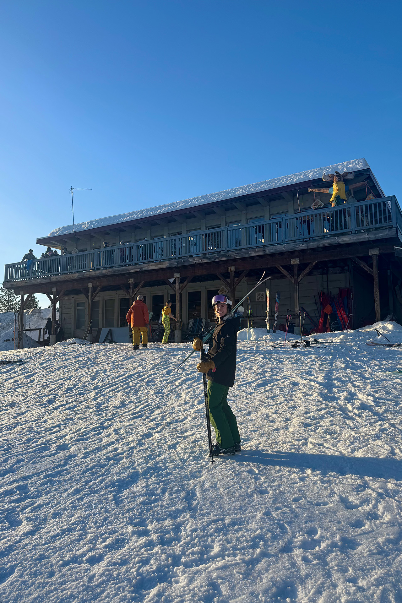 Isabel exhibits her best impression of Zoolander’s “Blue Steel” in front of the lodge at Little Ski Hill, all smiles after successfully scoring the Central Idaho Hat Trick.