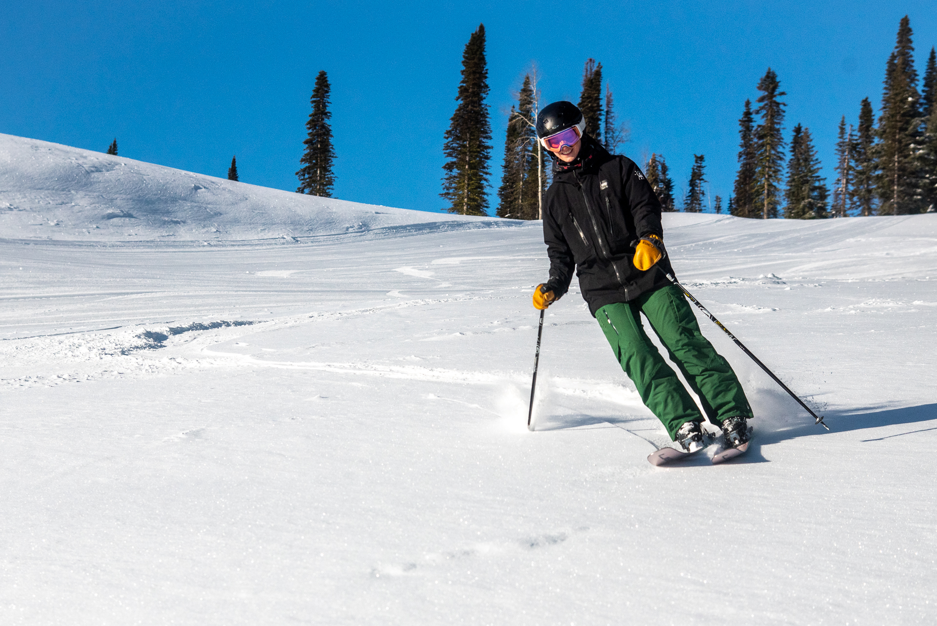 Despite no fresh snowfall in several days, we luck out and find a few windblown zones to wiggle around in towards the bottom of our one run at Tamarack.