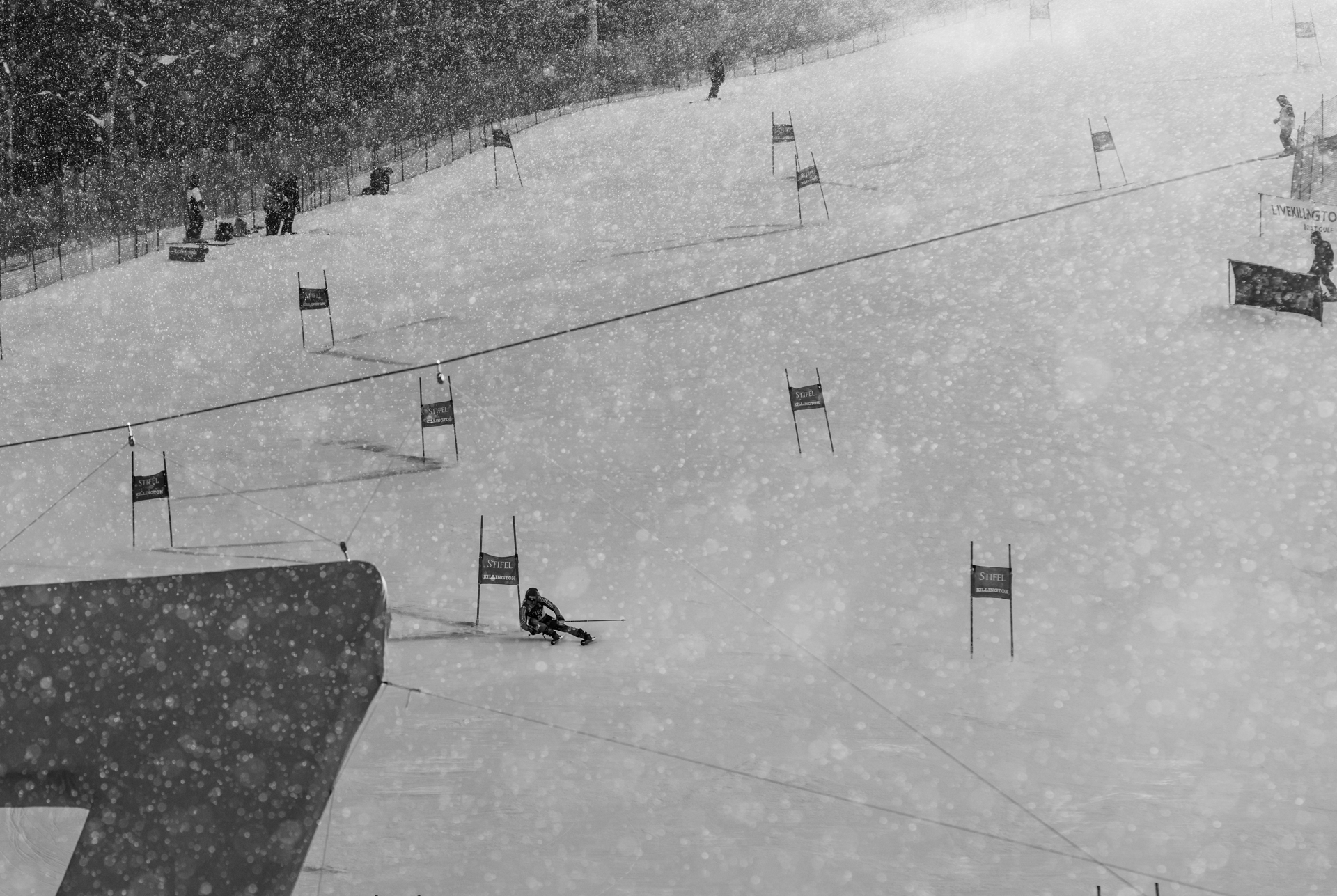 Snow blankets the course midway through the first run as a racer weaves through the gates. The conditions were ever-changing, and the flat light did not help with the glacier-like conditions.